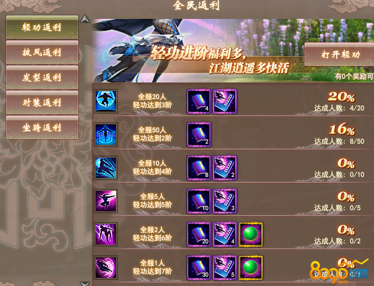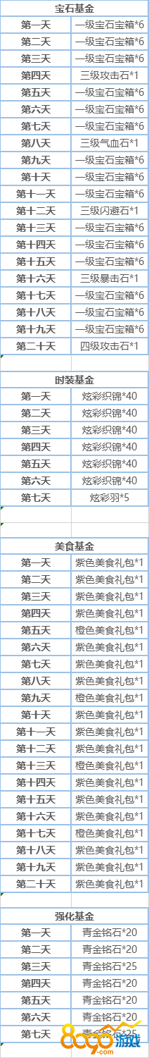 活动内容:开服前三天,宝石基金、时装基金、美食基金、强化基金