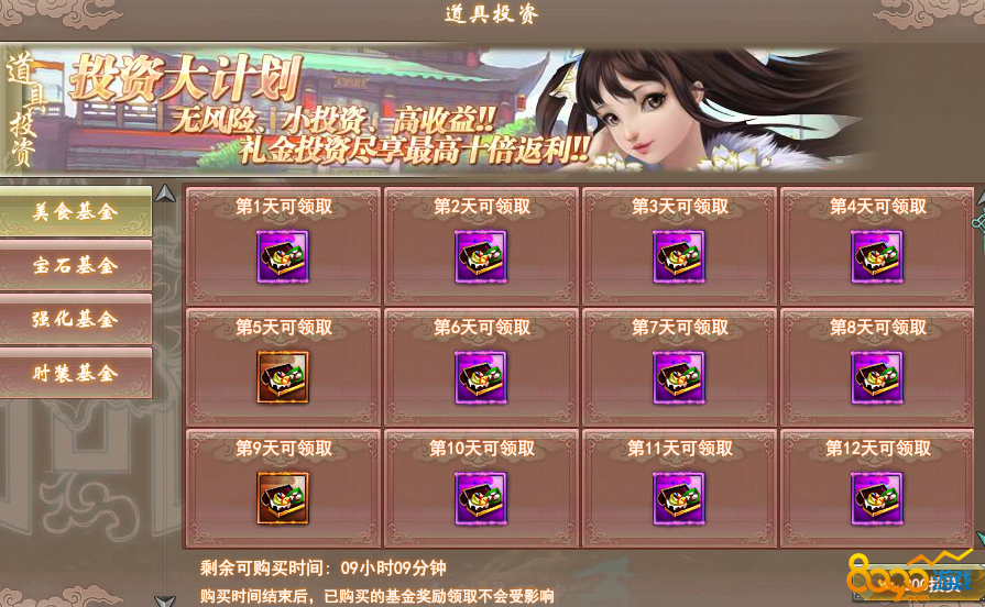 活动时间:自开服起分阶段开放多种基金,购买后每天领取道具
