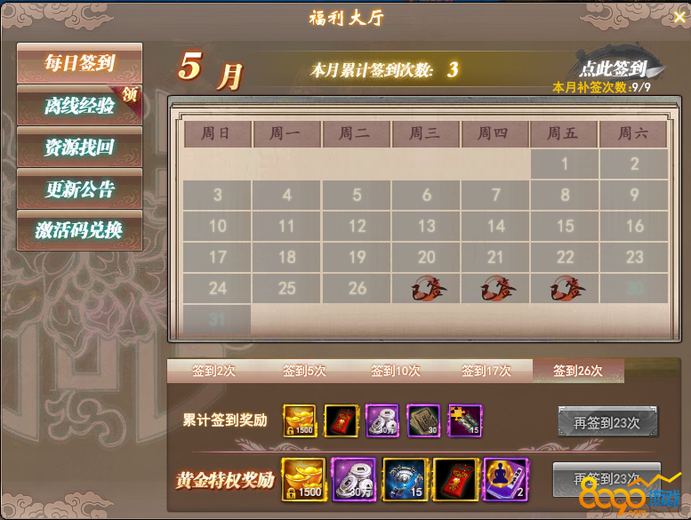 搜索"8090网页游戏"8090《武圣传》福利大厅中包含每日签到、离线经验、资源找回、更新公告、激活码兑换。