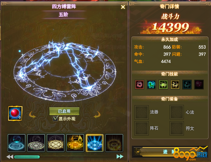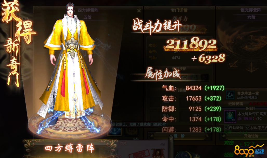 开启等级:奇门系统在玩家达到52级开启,开启后,可以对奇门进行进阶,进阶成功后,可以提升战斗力和玩家属性