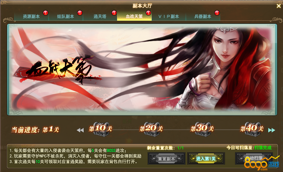 8090《武圣传》血战天策为单人通关副本,所通关卡数越多,获得的奖励就越多。