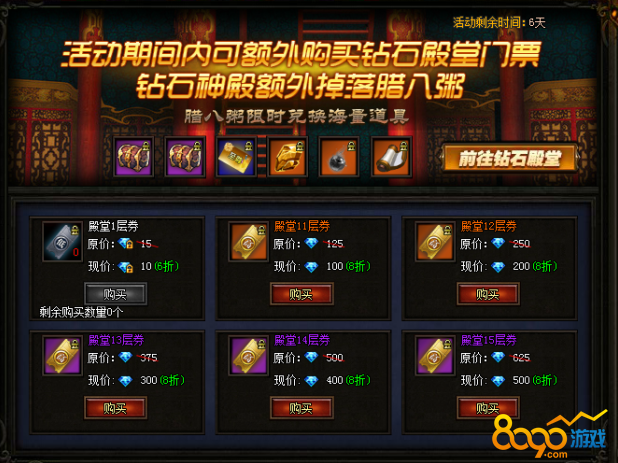 活动方式:钻石殿堂增加额外门票购买商店,仅限腊八节活动期间,并且全面打折