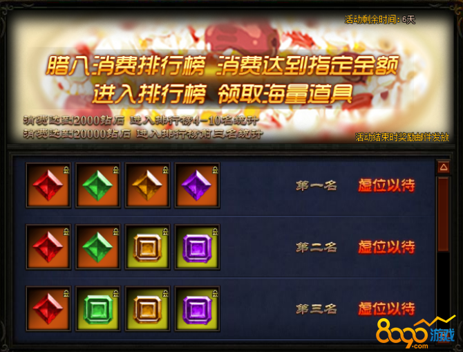 消费排行第4-6名:6级红包*1,5级绿宝石*1,5级黄宝石*1,5级紫宝石*1