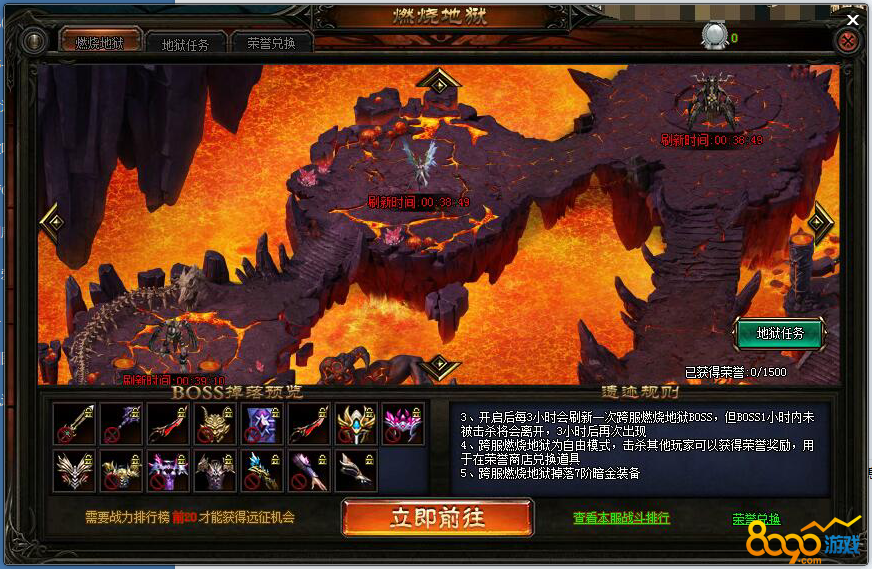 搜索"8090网页游戏"无尽燃烧地狱活动时间在每天8:45-23:45,参与等级大师150级以上,活动地图燃烧地狱,开启每3小时会刷新一次跨服地狱BOSS,但一个小时没能将BOSS杀死,BOSS将会离开,3小时后会出现。