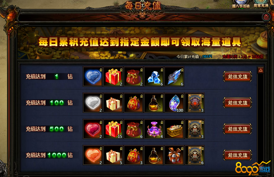 每日充值达到1000钻石是比较值的,可领取力天使之怒的翅膀幻灵,生命上限3000,最大伤害600,最小伤害600伤害加成0.5%,战力增加2200,并且赠送传奇大礼包有宝珠之魂5个,传奇卷轴5个,传奇矿石5个,传奇重铸石3个。
