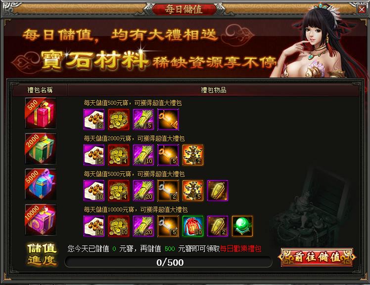 活动内容:活动期间,每日充值指定数额元宝,皆有大礼相送,宝石材料稀缺资源享不停!