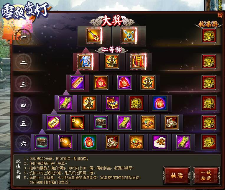 活动内容:活动期间,每消费200元宝,获得一点抽奖点,就可参与一次抽奖。各种给力道具等你来拿,抽奖有机会获得酷帅时装“冰雪寒衣”和“喜庆春装”,霸气时装武器“冰雪之器”和“贺岁神器“。