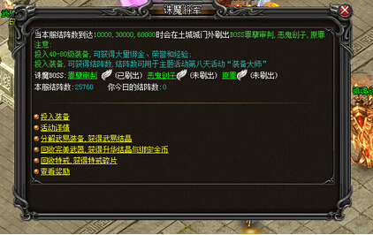 玩家赠送装备给诛魔将军后,自动获得结阵数,这结阵数可不是你一个人的,而是全服玩家一起累积的。