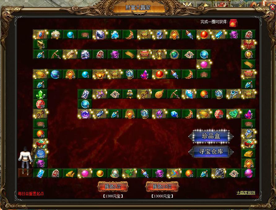 1、点击摇色按钮,根据摇出的点数(1-6)向右移动,玩家即可获得停止格子上对应的物品奖励,奖励将自动进入寻宝仓库。点击摇色10次则连续进行10次摇色,可获得10次奖励。