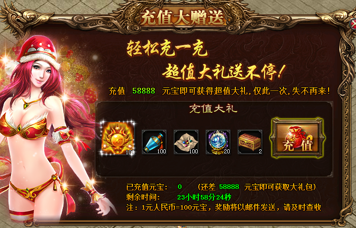 活动简介:活动期间,累计充值达58888元宝,即可领取活动礼包。