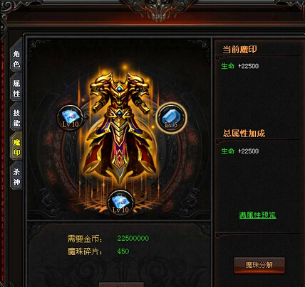 人物等级达到60、65、70级分别可解封第1、2、3个魔印,激活每个魔印需要花费魔珠碎片和金币。只有解封的魔印才能进行激活和升级操作。