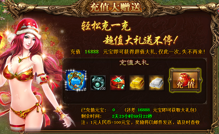 活动简介:活动期间,累计充值达16888元宝,即可领取活动礼包。