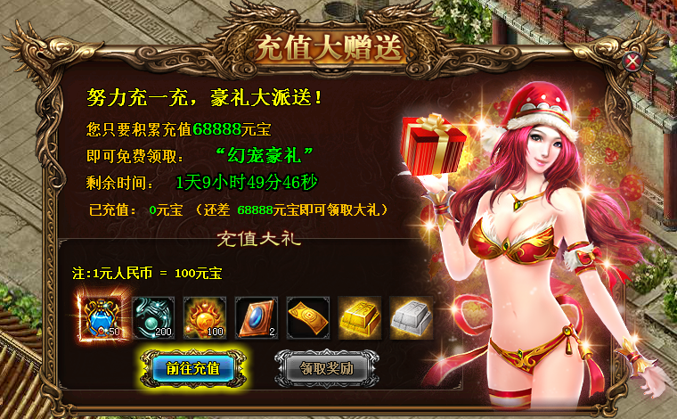 活动简介:活动期间,累计充值达68888元宝,即可领取活动礼包。