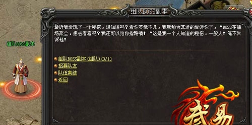 组队BOSS副本以擂台车轮战的形式进行,人物等级达到40级后,在土城找到“组队BOSS副本”NPC,就可以可以邀上基友开战组队副本。击杀小尸王热热身后,点击选择BOSS召唤,就可以与他在擂台上战个痛了!在擂台周围,六大地图BOSS等待你的召唤,每局只能1vs1进行对战,组队副本每天能刷1次,也可用副本通行证X2增加次数,每天仅可增加1次。在30-60分钟的副本时间内,和小伙伴们同心协力击杀赤血恶魔BOSS即可通关,并获得额外的礼券奖励。