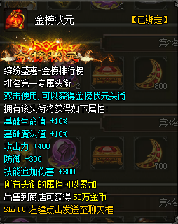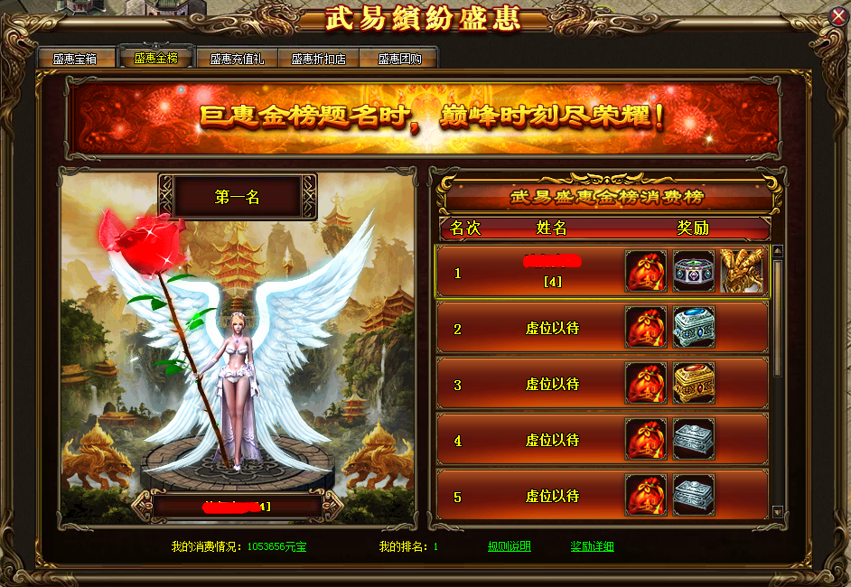 活动详情:活动期间,全平台玩家消费元宝额不低于50万元宝的玩家,都可以上榜获得对应奖励。前十名获得对应排名奖励,其余上榜玩家获得达标奖励。活动最后一日(第5日)23点30分将截止消费统计,根据排名情况,对上榜玩家邮件发放奖励。