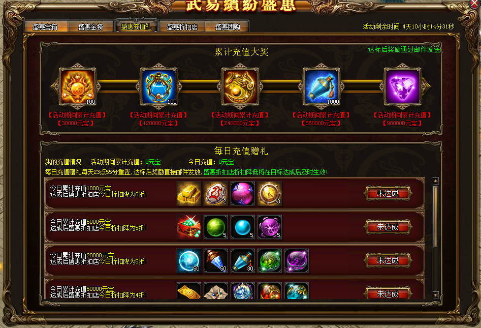 活动详情:活动期间,玩家累计充值达到指定元宝,可以获得对应等阶的奖励。每日充值达到指定元宝,也可获得每日充值赠礼的道具。另外,每日充值赠礼达到指定标准后,更可将盛惠折扣店的当日折扣降为对应折扣。
