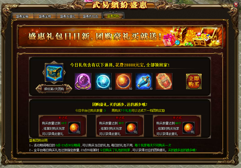 活动详情:活动期间,玩家每天的0点-23点30分在该界面购买礼包,每天有不同的礼包,每个玩家每天只可购买一个。每天23点55分结算时,根据当日本平台全部服务器购买的礼包数量达成的团购豪礼标准,为每位购买过该礼包的玩家,通过邮件发送额外的豪礼奖励。