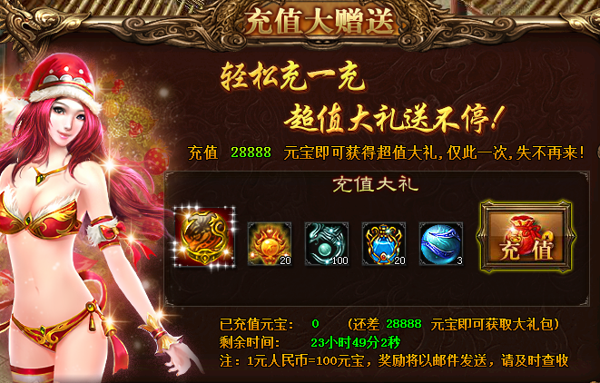 活动详情:轻松充一充,大礼送不停!活动期间充值达到指定数额的元宝,即可获得超值大礼,机会仅此一次哦!