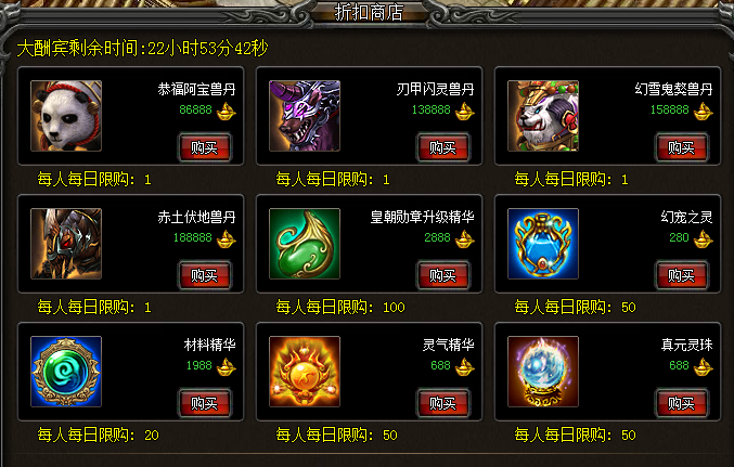 活动详情:活动期间折扣商店全场低折出售,每种商品售完即止。每位玩家限购一定数量的商品。部分商品要求满足一定等级才能购买。物美价廉,不要错过哦!