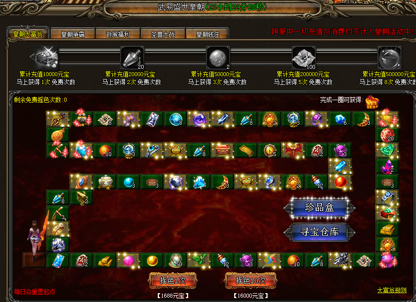 活动详情:玩家在活动中累计充值,可以获得对应奖励,并获得免费的大富翁摇骰子次数(免费摇骰子只可以通过摇色一次消耗,摇色10次不消耗免费次数)。玩家摇骰子走指定步数,可以获得该格子上的道具。如果走到带有红色特效环绕的点上,除了可以获得格子内的道具之外,还可以获得皇朝碎片(皇朝碎片可以在珍品盒中兑换各类珍稀道具)。走完一圈后,还会额外获得一个大富翁礼包。