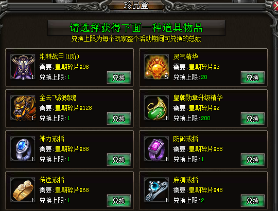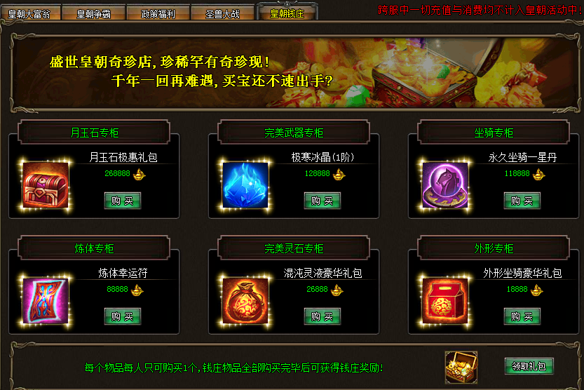 活动详情:活动期间,玩家可以在皇朝钱庄中购买各类罕有道具,全部道具购买完后,可以在界面领取到钱庄礼包一份。外形坐骑豪华礼包更有多种给力新品。