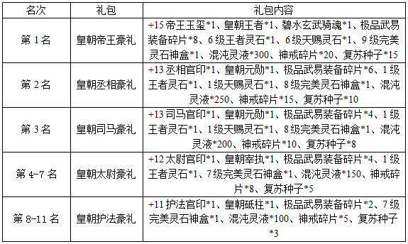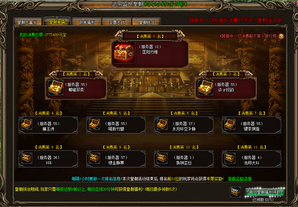 充值元宝送礼,根据每日充值的情况,赠送对应档次物品;官员送福利,是皇朝争霸中前11名的玩家,有资格花费8888元宝,给予自己服务器所有在线1转60级或以上的玩家一次领取福利的机会。每个玩家每日最多发送5次福利,最多领取8次福利,自己发送的福利自己不可以领取。同时发送福利后,自己也可以获得物品奖励。