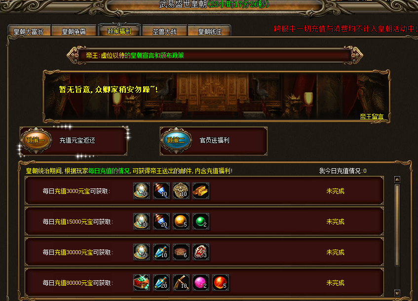 活动详情:皇朝政策福利分两种,一是充值元宝送礼,二是官员送福利。