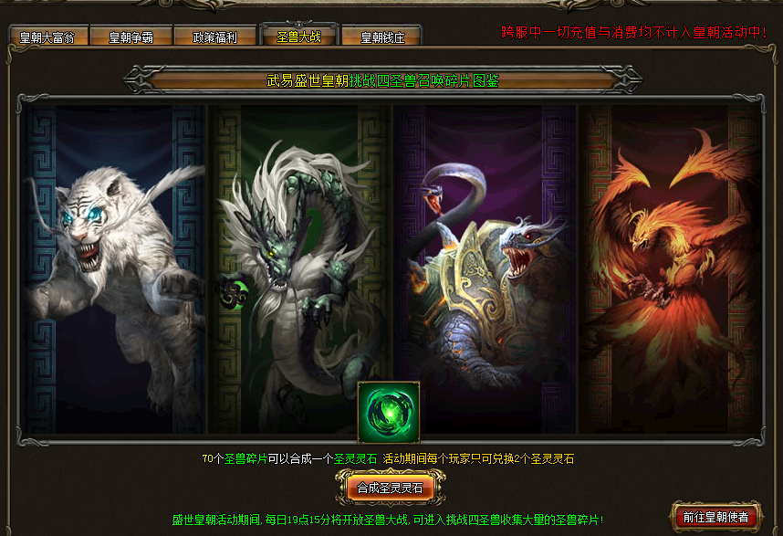 活动详情:活动开始后,1转65级以上的玩家,每日19点15分开始,可在武城NPC-武易皇朝使者处进入活动场景,击败每个场景的圣兽BOSS后可通过伤害排名(前10名)、最后一击、boss掉落,获取丰厚奖励!活动中掉落的圣兽碎片,可以在活动界面兑换圣灵灵石,每个玩家活动中最多兑换两个圣灵灵石。