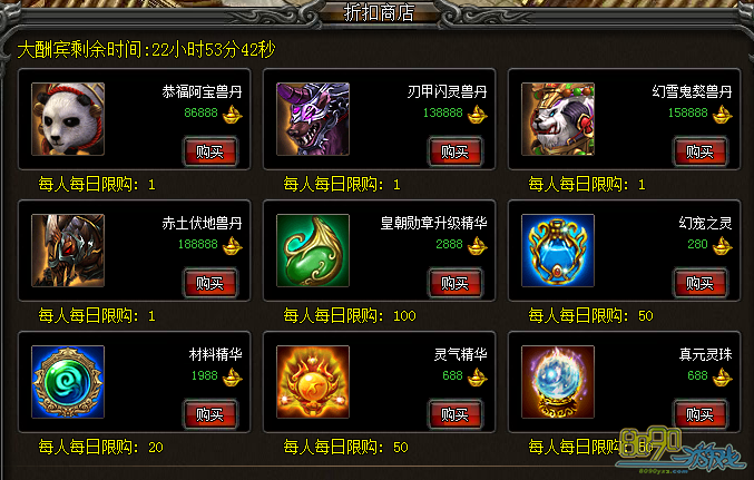 活动详情:活动期间折扣商店全场低折出售,每种商品售完即止。每位玩家限购一定数量的商品。部分商品要求满足一定等级才能购买。物美价廉,不要错过!