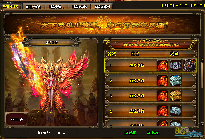 活动详情:活动期间,本平台全部服务器消费不低于50万元宝的玩家可上财富排行榜,上榜的前十名玩家可获得对应排名大奖,其余上榜玩家可获得达标奖励。