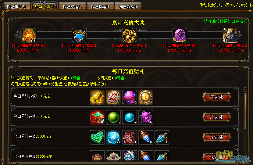 活动详情:活动期间,玩家累计充值达到指定元宝,可以获得对应等阶的奖励;每日充值达到指定元宝,也可以获得每日充值赠礼的道具。每天23点55分重置昨天的数据,两类奖励达标后自动邮件发送。