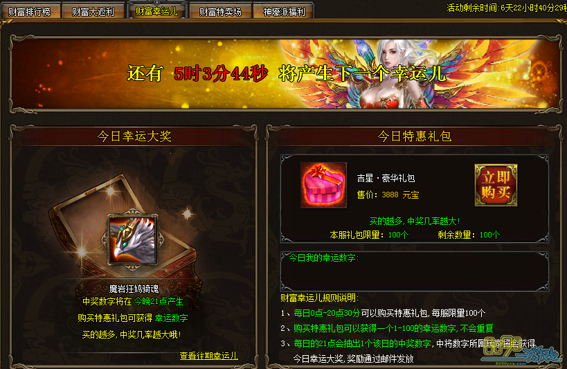 活动详情:活动期间,每天本服会有限量出售的100个特惠礼包,玩家购买特惠礼包可以获得一个1-100的幸运数字,每个幸运数字都不会重复。每天21点整,会抽出本服的中奖数字,拥有这个中奖数字的玩家,可以获得今日的幸运大奖!