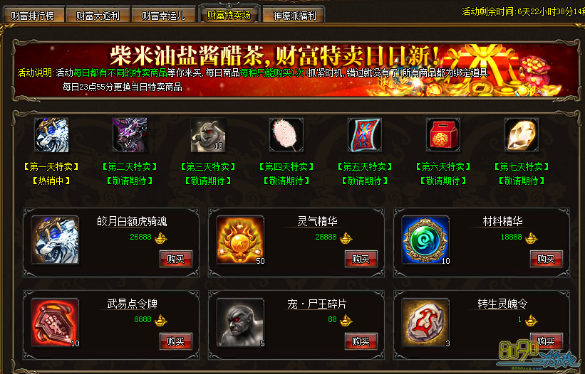 活动详情:活动期间每天都会有6个特卖折扣道具,每个特卖物品只可购买1次,抓住时机哦!已经过期的特卖,还可使用补买珍品功能补买当日的特卖物品,当日已经购买过的不能再补买。