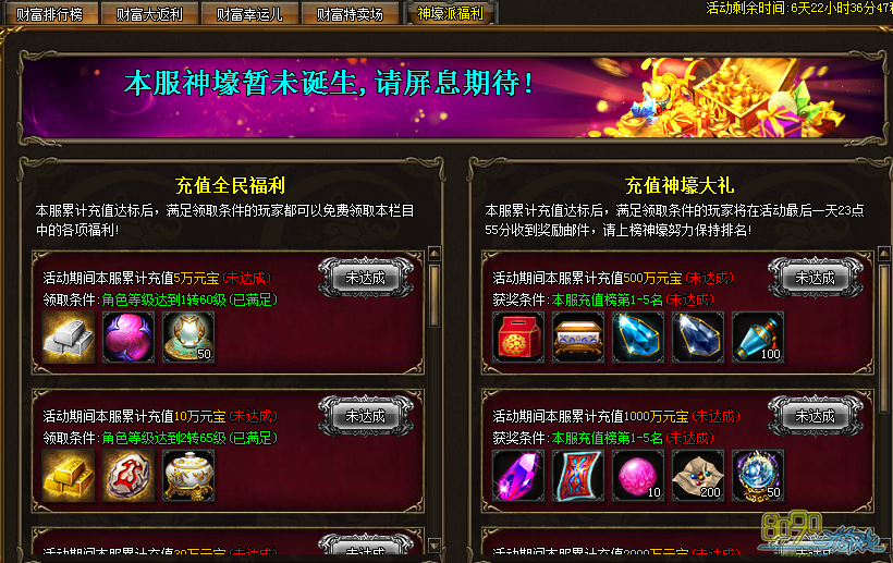 活动详情:活动期间,本服全民充值累计达到一定额度,并且玩家个人满足领取条件,就可以在界面上领取奖励;本服充值累计达到指定金额,充值排行榜前5名玩家将在活动第七日23点55分结算时,获得充值神豪大礼的奖励!