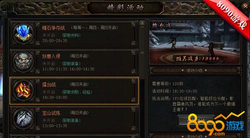搜索"8090网页游戏"在8090我欲封天,小伙伴在飞速提升等级的同时,是不是也厌倦了每日打BOSS的单一活动,想要和众高手较量一番来证明自己的实力呢!现在,擂台战活动就可以给你机会让你彰显实力!你想来参加吗!话不多说,接下来,就一起来游戏里看看擂台战的玩法!