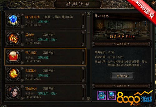 在游戏里,玩家的等级到达102级,就可以参加开心问答活动,活动会在每天的17:00开启哦!玩家可要记得时间啊!