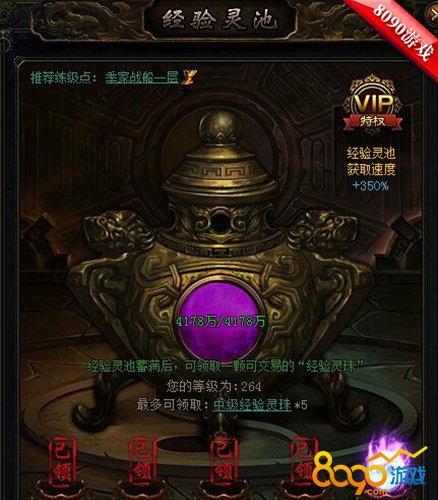 当一颗经验灵珠存储经验满了即可领取。 这里就要提到多倍领取了,根据玩家VIP等级来说,可以双倍,四倍,最多八倍的领取经验灵珠存储的经验。一天可以领取五颗经验灵池的经验。试想八倍领取慢慢的一池经验是不是一下就飙升等级了呢,领取灵池之后还会获得经验灵珠,直接吃掉能增长灵池,让玩家更快的领取经验。玩家刷灵池的时候,开双倍,三倍,四倍经验卷轴更加快速哦!感兴趣的玩家就快来游戏里看看!