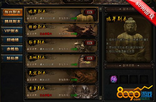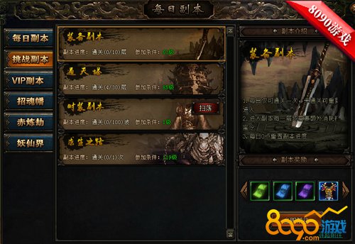 搜索"8090网页游戏"不管是什么游戏副本永远是组成这个游戏的重要部件,在8090我欲封天中也是一样哦,所有你想要获得的一切材料这里都有并且除了可以获得装备之外还可以获得积分,兑换一切你需要的道具哦。