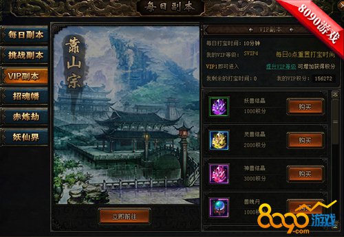 最后一个要说的就是游戏中需要花钱的副本了,之所以说是花钱是因为只有VIP的玩家才可以进入哦,但是进入的条件并不高只需要大家达到VIP1就行了,而且这个副本中还可以获得大量的VIP基本可以在积分区购买自己需要的道具哦,什么妖兽结晶、兽魄丹神马的里面都有哦。
