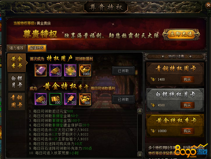 我欲封天中的贵族系统不同于vip,能够每天领取奖励,那么黄金贵族卡到底值不值得购买呢?小编今天给大家分析一下。