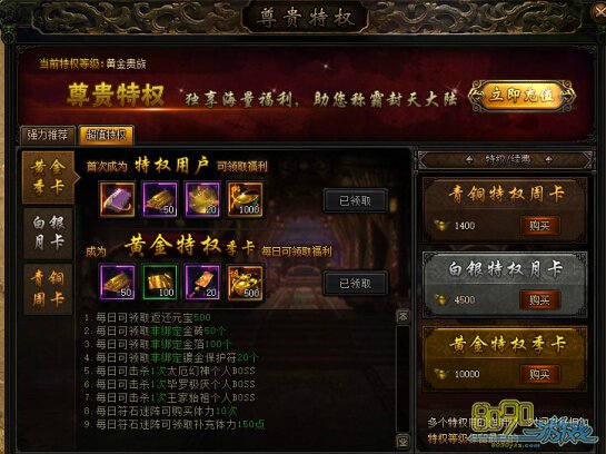 成为黄金特权季卡(每日可领):金砖*50 金箔*100、保护符*20、返还元宝*500