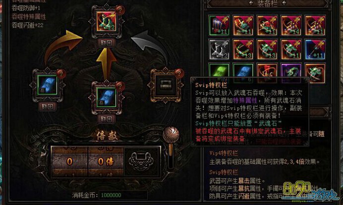 将装备放入装备栏,下方最左侧的副装备栏使用同等阶级的装备吞噬符,主装备可随机获得基础属性。当vip等级达到四时,第二个装备栏解锁,同时,放入同等级的吞噬符,主装备吞噬的基础属性随机获得2.3.4倍的效果。成为svip会员时,即所有装备栏都开启,第三个装备栏只可放入武魂石吞噬,主装备增加特殊属性。