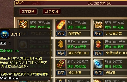 玩家只需打开元宝商城,就能在绑定商城购买聚灵珠,聚灵珠是玩家升级必备的道具。