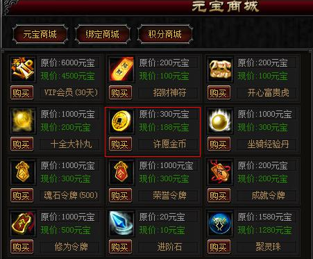玩家可从元宝商城第一页购买许愿所用的金币。