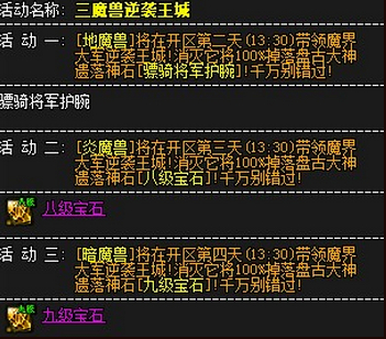 三魔兽有不同的物品掉落,而且几率是100%的。地魔兽是掉落骠骑将军护腕,而炎魔兽是掉落八级宝石,最后的暗魔兽是掉落九级宝石。而且按照这个顺序每天刷新一个BOSS的。所以在这个活动中,参与竞争玩家也是非常多的,因为掉落的物品珍贵程度是非常高,而且越来越高。所以一定要组织一支强大的队伍去打boss,避免最后被别人抢掉。