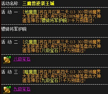 首先3魔兽指的是地魔兽、炎魔兽以及暗魔兽,在开区的第二天到第四天每天的下午1点半刷新BOSS。王城刷新BOSS之后请组队去击杀吧。三魔兽有不同的物品掉落,而且几率是100%的。地魔兽是掉落骠骑将军护腕,而炎魔兽是掉落八级宝石,最后的暗魔兽是掉落九级宝石。而且按照这个顺序每天刷新一个BOSS的。所以在这个活动中,参与竞争玩家也是非常多的,因为掉落的物品珍贵程度是非常高,而且越来越高。所以一定要组织一支强大的队伍去打boss,避免最后被别人抢掉。