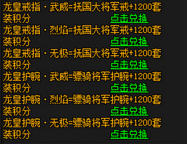 龙皇装备是玩家使用富国大将军戒和骠骑将军护腕加上套装积分[100%]升级为龙皇准备,同类物品只能佩戴一个。也就是说玩家能装备上一个极品的机制或者护腕了,而这两个部位中护腕应该是算极品中的极品了。