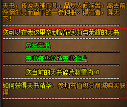 合成天书的npc位置在云霄城,玩家可从云霄城找到护符大师,坐标(75,148),和他对话打开对话面板。护符大师有两个功能,兑换护符以及兑换新的天书,玩家可以看到兑换天书和天书精华兑换天书碎片的选项。点点击“兑换天书碎片”,即可将包裹内的天书精华兑换为天书碎片。1级天书主要有2个获取方式,玩家即可使用3个天书精华兑换,也能在活动中充值10000元宝即送天书(1级)。