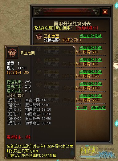 武尊面甲系统在沙漠土城的饰品大师处兑换,位置大家应该都知道,一级面甲是汲血面甲,可以用3个铁精之灵兑换升级,铁精之灵可以通过游戏里的活动获得,也可以直接通过充值积分兑换,获取方式并不难。如果玩家需要升级面甲,将消耗更多的的铁精之灵。