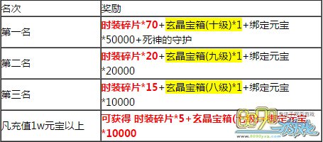 (前三名上榜需分别满足充值30w、10w、5w元宝,其余上榜条件均为1w元宝,烈焰死神时装需要区分性别)